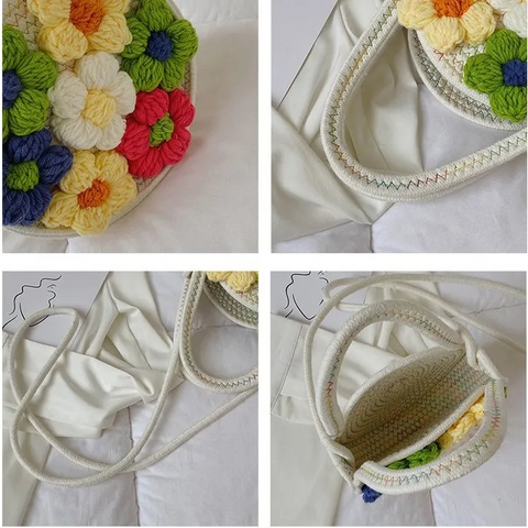 Knitted folk bag women knitted holiday handbag summer messenger bag cotton cord woven flower bag